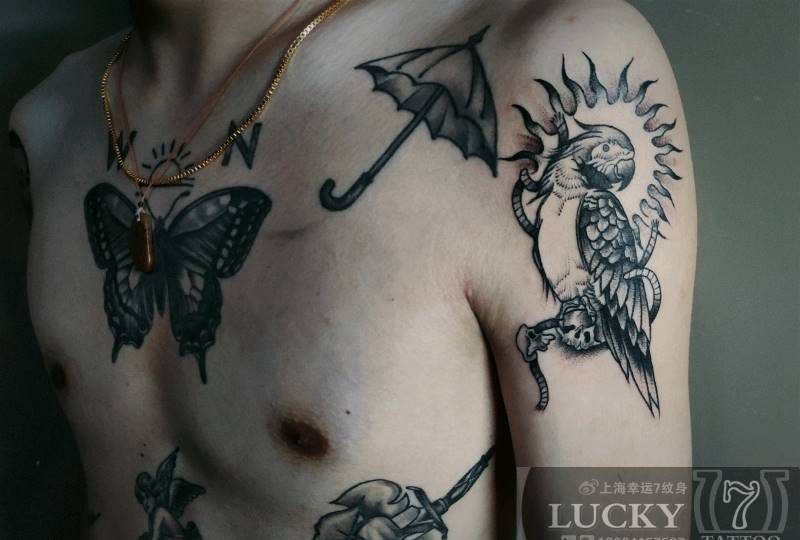 鹦鹉|幸运7纹身纹身图片_肩部Old School纹身图案