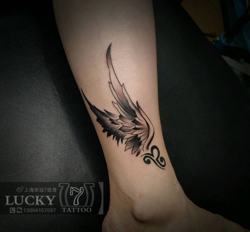 天秤座|翅膀|幸运7纹身纹身图片_腿部黑灰纹身图案