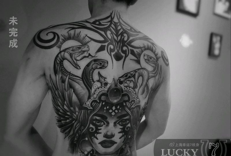 当前位置: 首页 >上海市纹身店-幸运7纹身Lucky7tattoo纹身图案>蛇女“美杜莎”|幸运7纹身纹身图片_背部New School未完成纹身图案