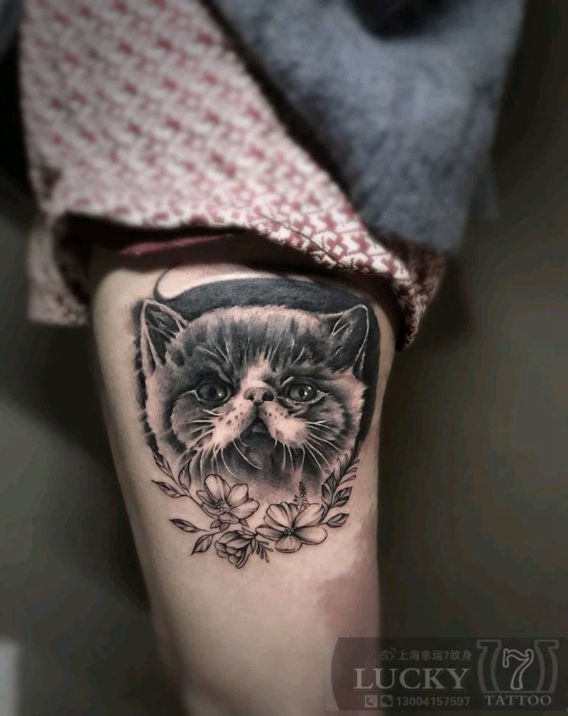写实猫头|幸运7纹身纹身图片_欧美写实大腿纹身图案