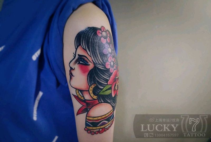 女郎|幸运7纹身纹身图片_手臂Old School纹身图案