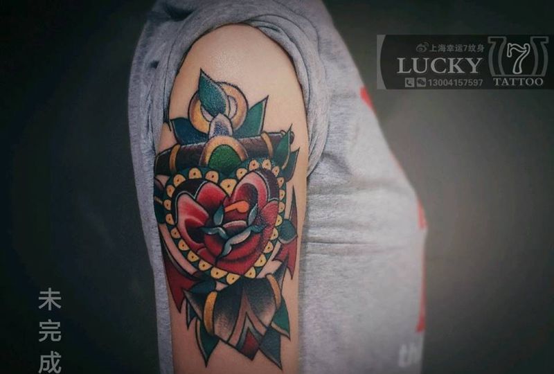 玫瑰船锚|幸运7纹身纹身图片_手臂Old School未完成纹身图案