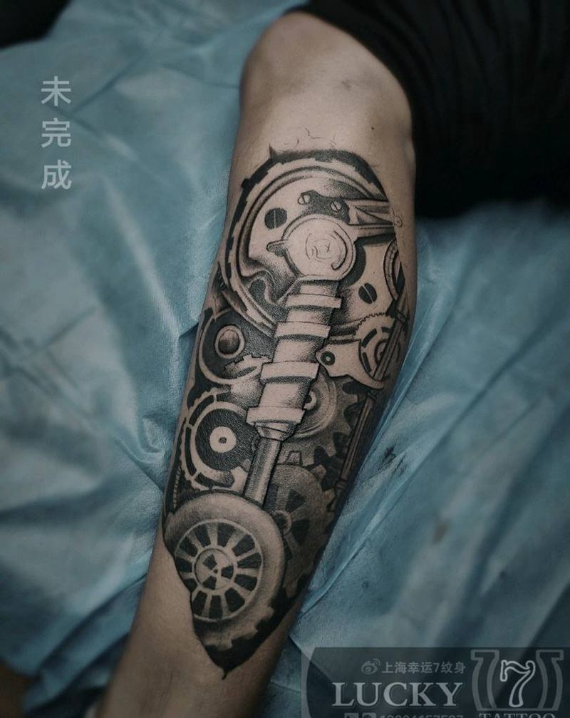 机械|幸运7纹身纹身图片_小腿黑灰未完成纹身图案