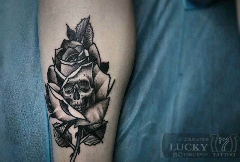 暗黑骷髅玫瑰|幸运7纹身纹身图片_小腿暗黑纹身图案
