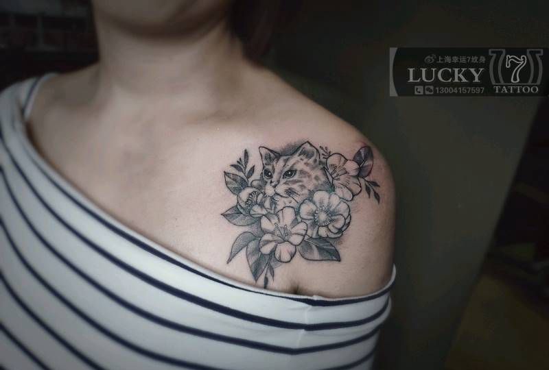 盖疤|素花猫头|幸运7纹身纹身图片_肩部盖疤清新纹身图案