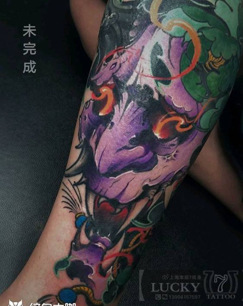 般若|幸运7纹身纹身图片_新传统小腿未完成纹身图案