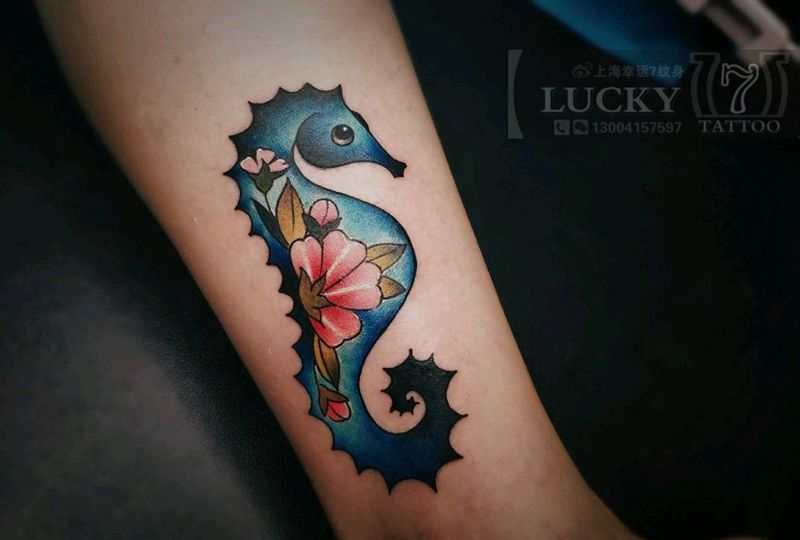 小海马|幸运7纹身纹身图片_New School小腿纹身图案