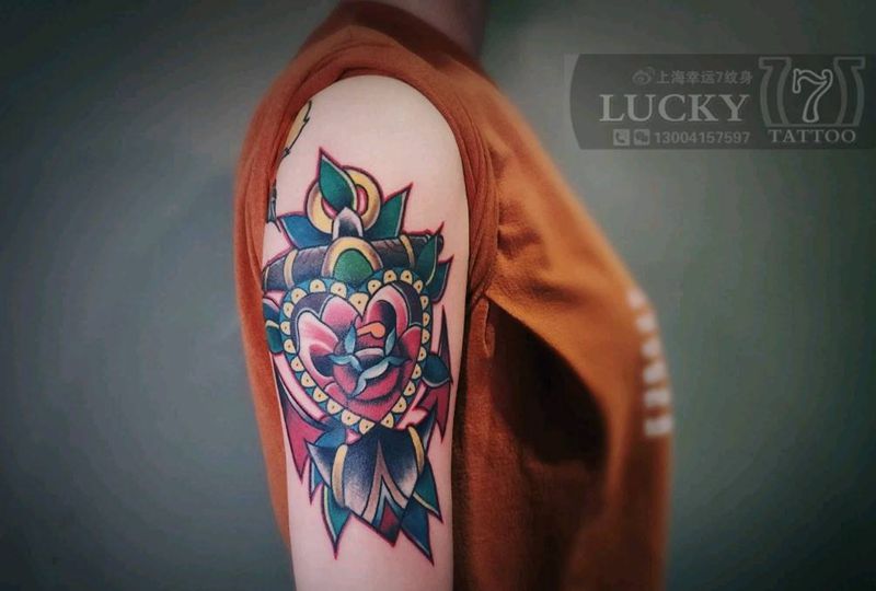玫瑰船锚|幸运7纹身纹身图片_手臂Old School纹身图案