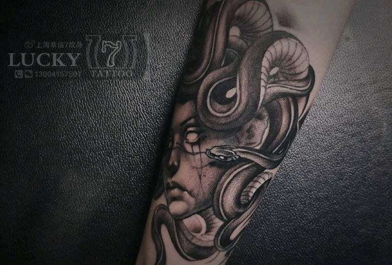 黑灰|蛇女美杜莎|幸运7纹身纹身图片_手臂欧美写实黑灰纹身图案