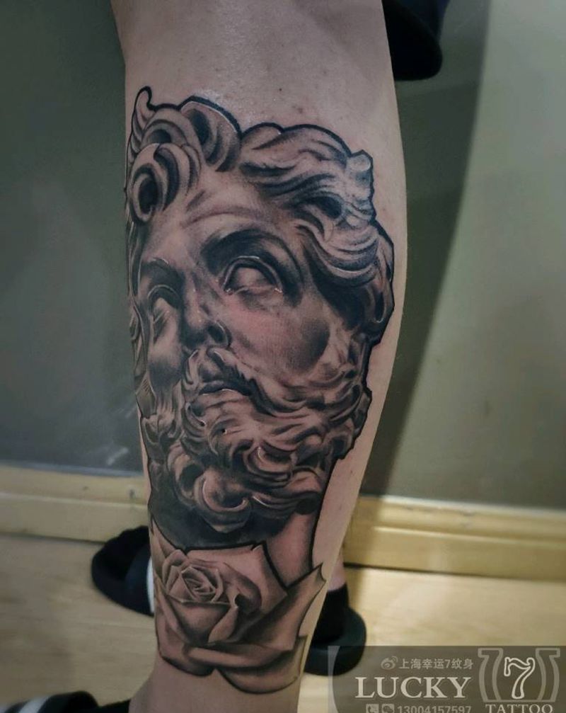 黑灰石膏像|幸运7纹身纹身图片_欧美写实小腿纹身图案