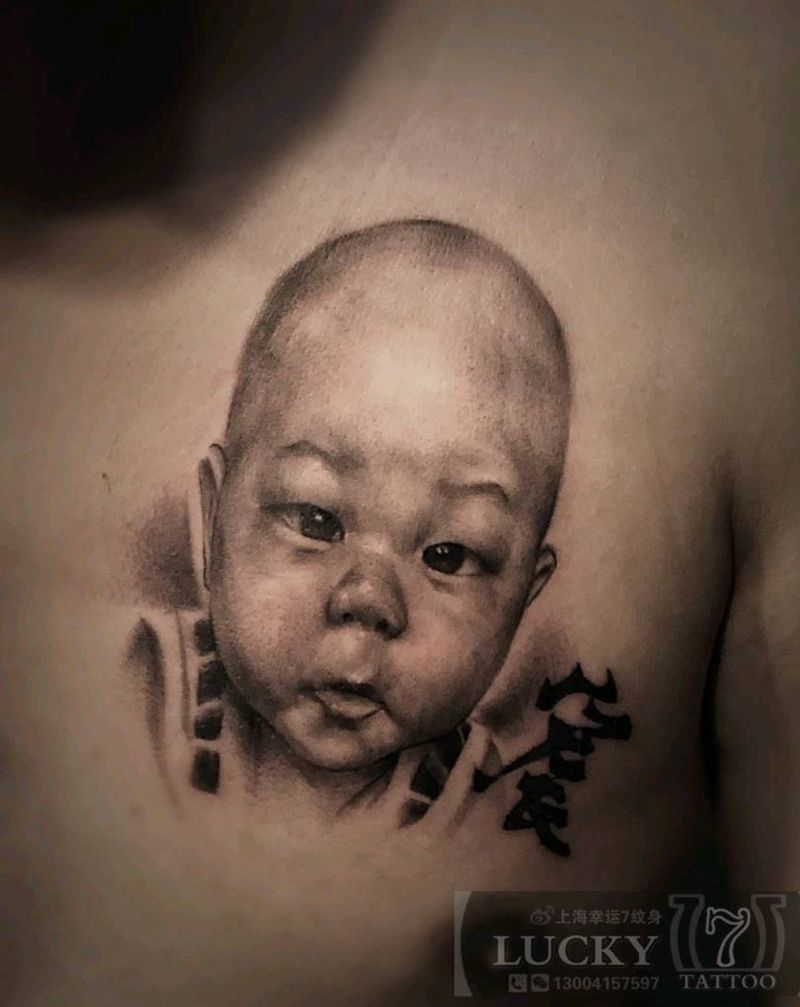 黑灰写实肖像|幸运7纹身纹身图片_胸部欧美写实纹身图案