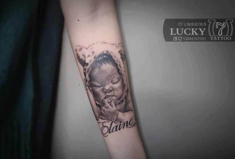 黑灰素描|宝宝头像|幸运7纹身纹身图片_手臂欧美写实素描肖像纹身图案