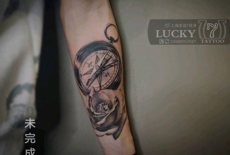 玫瑰指南针(未完成)纹身图片_手臂欧美写实未完成纹身图案