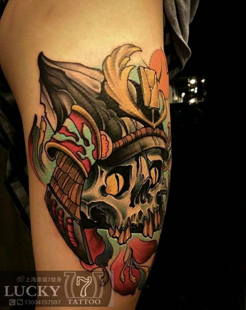 骷髅武士|幸运7纹身纹身图片_新传统New School大腿纹身图案