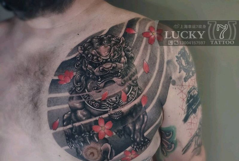 当前位置: 首页 >上海市纹身店-幸运7纹身Lucky7tattoo纹身图案>唐狮|幸运7纹身纹身图片_胸部新传统纹身图案