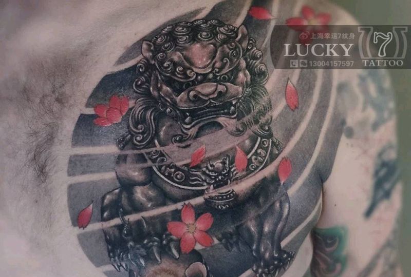 唐狮|幸运7纹身纹身图片_胸部新传统纹身图案