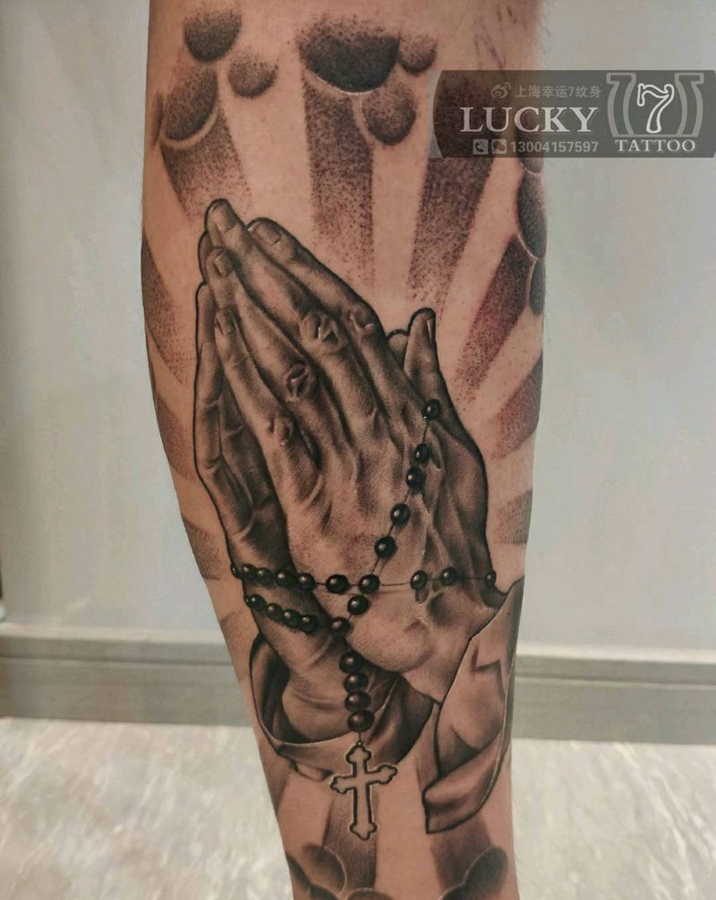 祈祷之手|幸运7纹身纹身图片_欧美写实小腿纹身图案