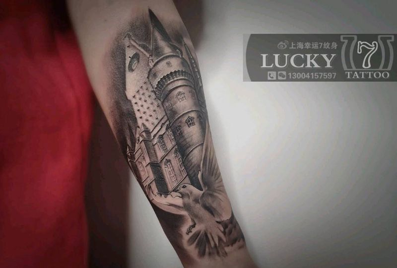城堡白鸽|幸运7纹身纹身图片_手臂欧美写实纹身图案