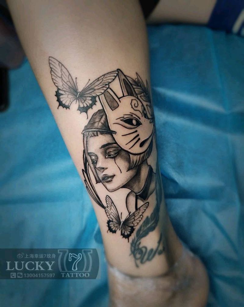 狐面少女|幸运7纹身纹身图片_脚踝纹身图案