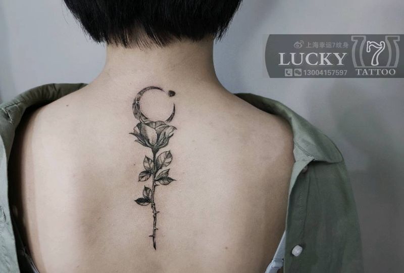 玫瑰|月牙|幸运7纹身纹身图片_背部点刺清新纹身图案