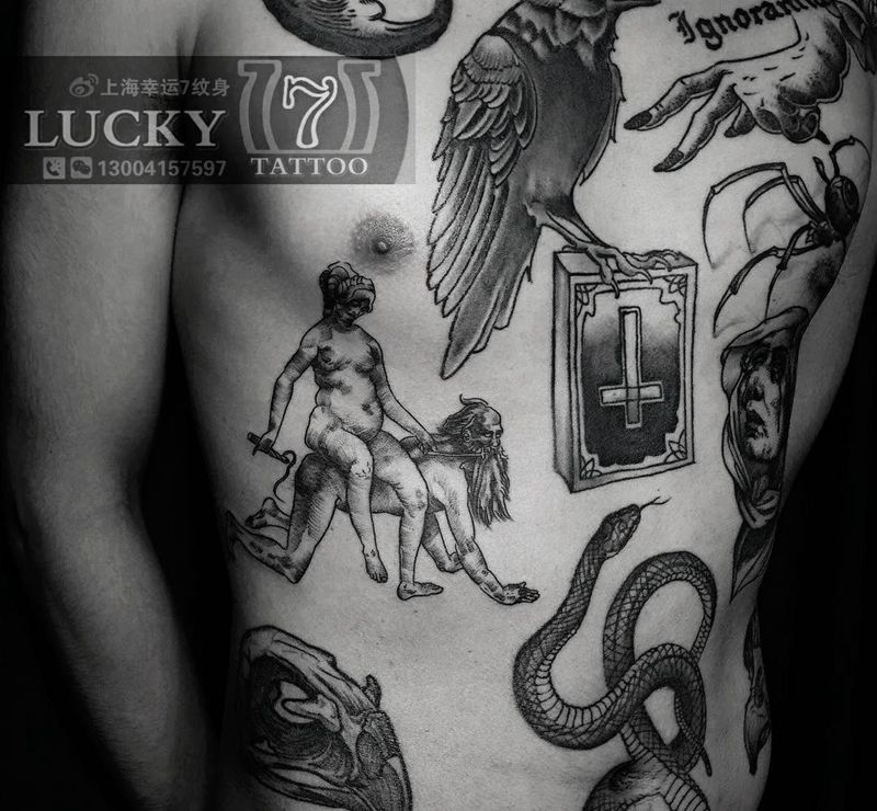 当前位置: 首页 >上海市纹身店-幸运7纹身Lucky7tattoo纹身图案>暗黑拼接|幸运7纹身纹身图片_胸部腹部Old School暗黑纹身图案