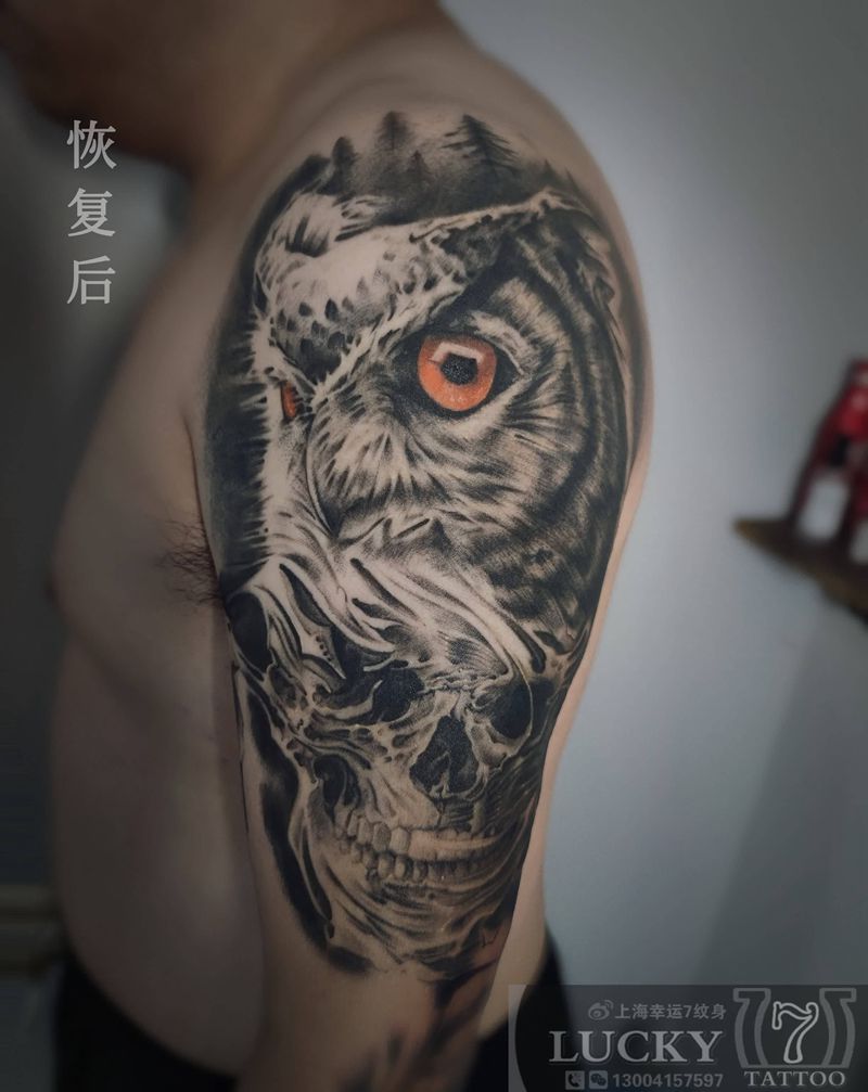 猫头鹰|骷髅|幸运7纹身纹身图片_手臂欧美写实恢复后纹身图案
