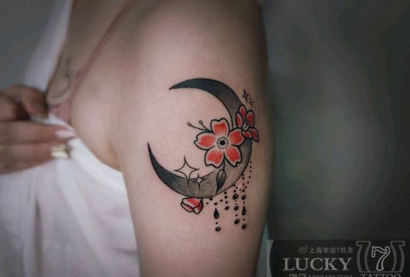 月亮|樱花|幸运7纹身纹身图片_手臂点刺纹身图案