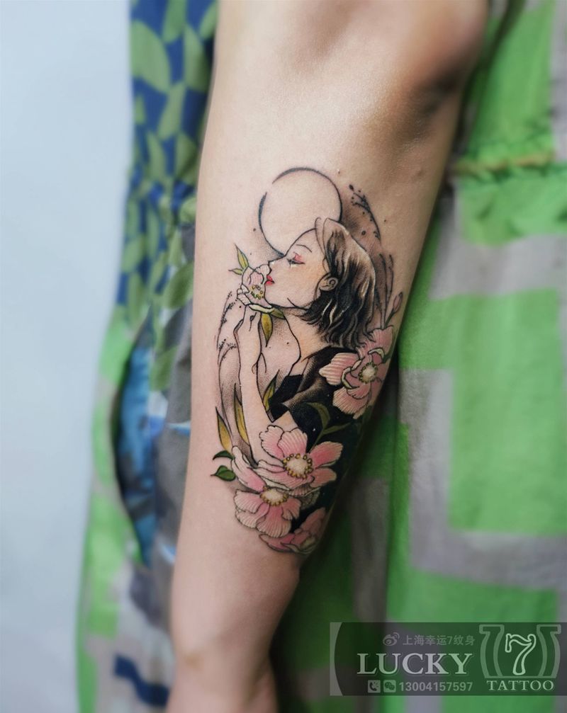 素花美少女|幸运7纹身纹身图片_手臂水彩清新纹身图案