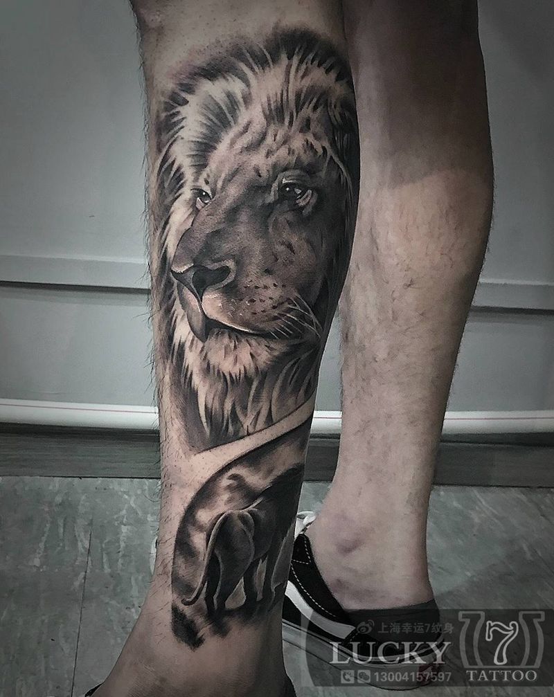 狮子|幸运7纹身纹身图片_欧美写实小腿纹身图案