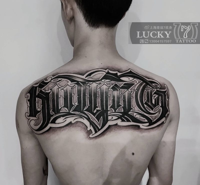 奇卡诺|花体字|幸运7纹身纹身图片_背部花体字纹身图案