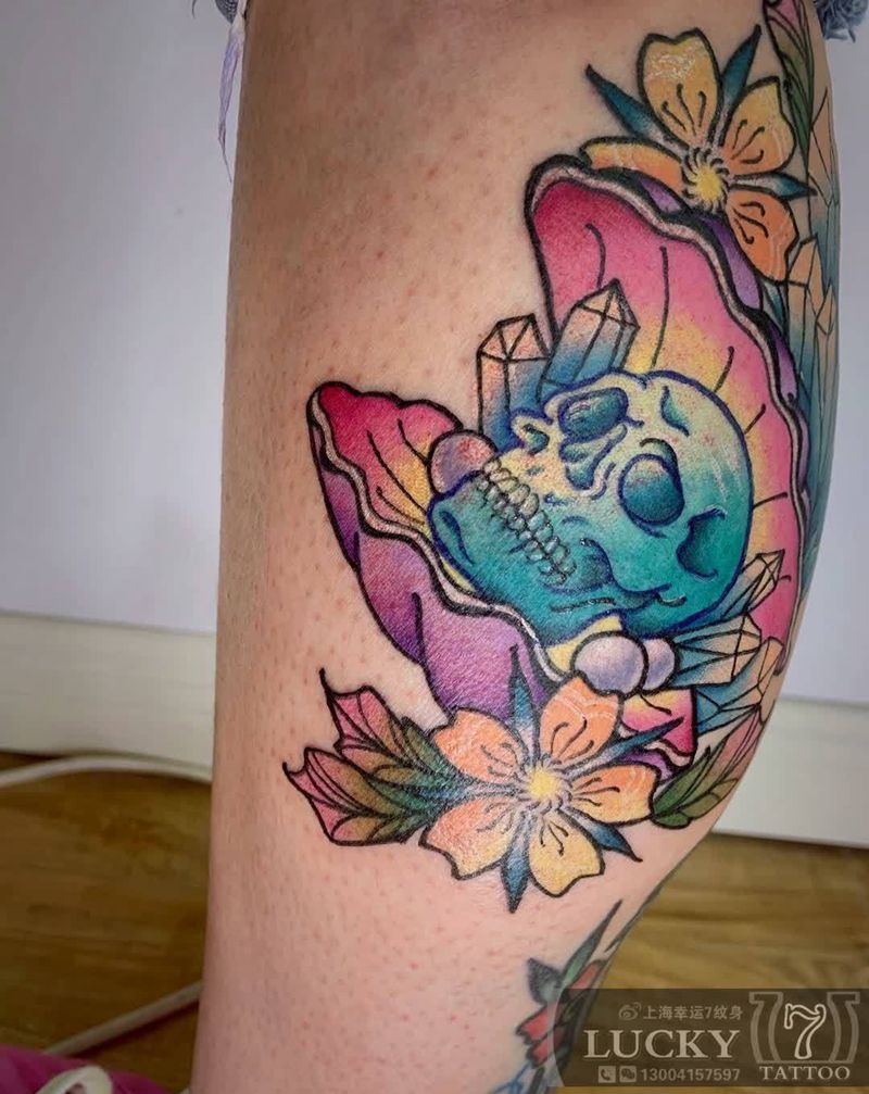 骷髅|贝壳|幸运7纹身纹身图片_New School小腿纹身图案
