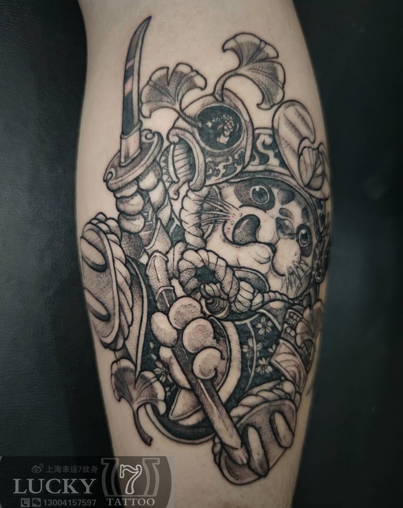 武士猫|幸运7纹身纹身图片_New School小腿纹身图案