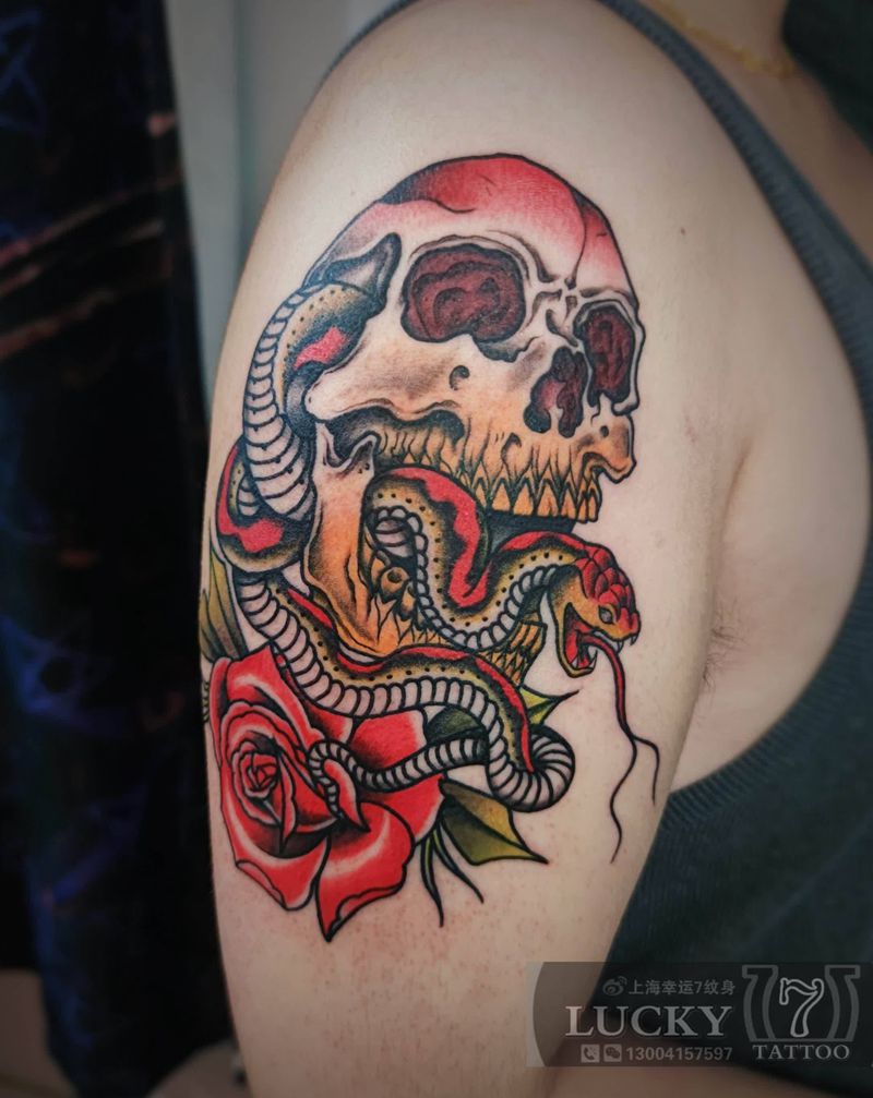 骷髅蛇玫瑰|幸运7纹身纹身图片_手臂Old School纹身图案