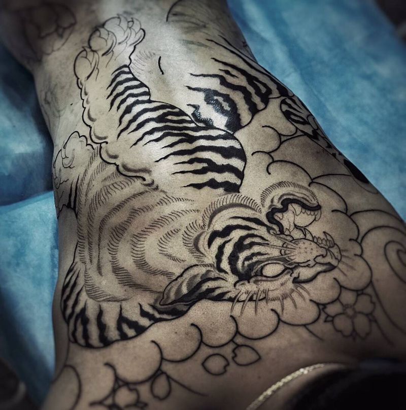 • T网红王老大花腿龙纹身图片_腿部新传统纹身图案
