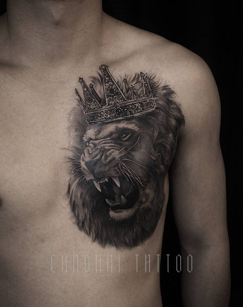 狮子纹身图片_胸部欧美写实皇冠纹身图案