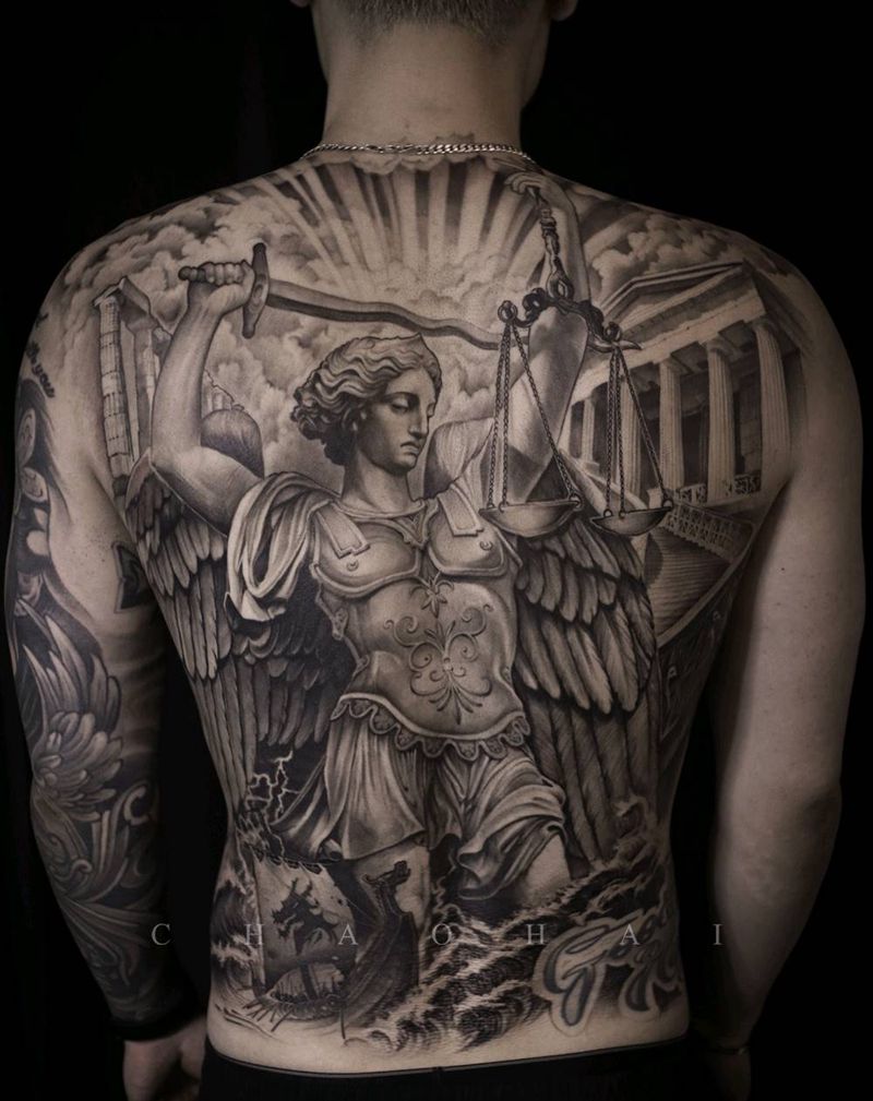 天秤座纹身图片_背部欧美写实雕塑天使满背纹身图案