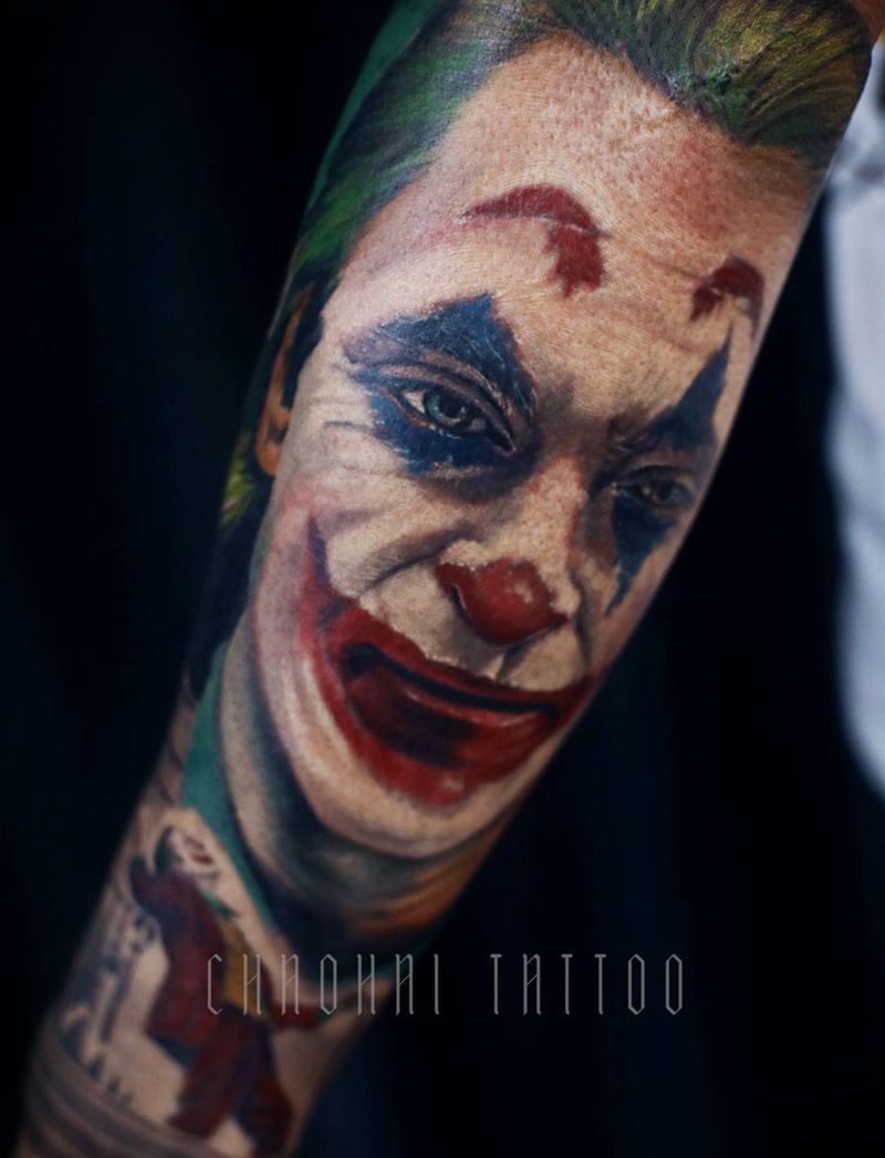 当前位置: 首页 >上海市纹身店-朝海刺青纹身图案>小丑joker纹身图片_手臂欧美写实油画肖像纹身图案