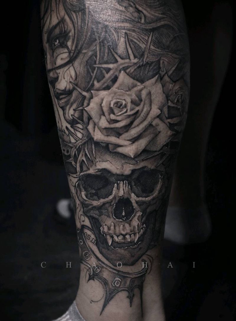 小腿 人物 狼 骷髅 玫瑰写实纹身图片_腿部欧美写实人物狼骷髅纹身图案