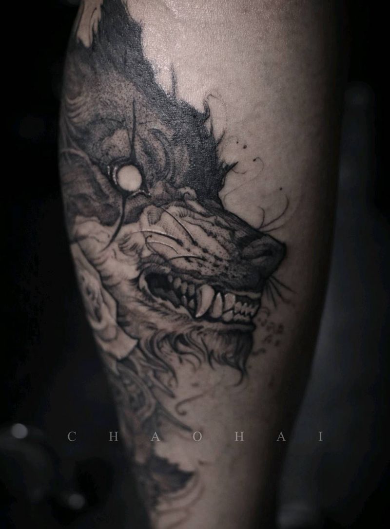 当前位置: 首页 >上海市纹身店-朝海刺青纹身图案>小腿 人物 狼 骷髅 玫瑰写实纹身图片_腿部欧美写实人物狼骷髅纹身图案