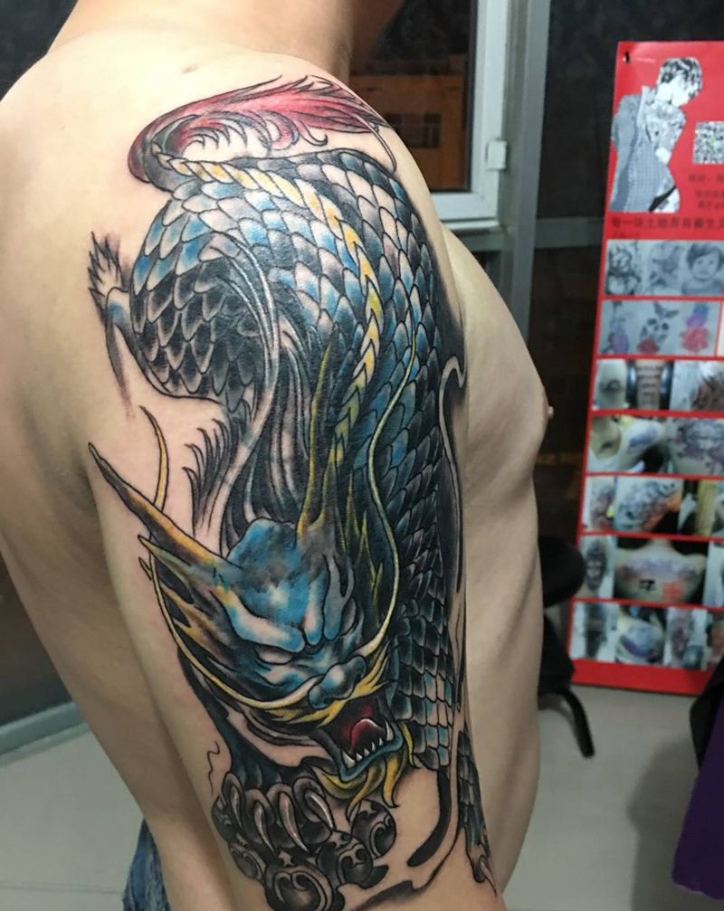 • T网红王老大花腿龙纹身图片_腿部新传统纹身图案