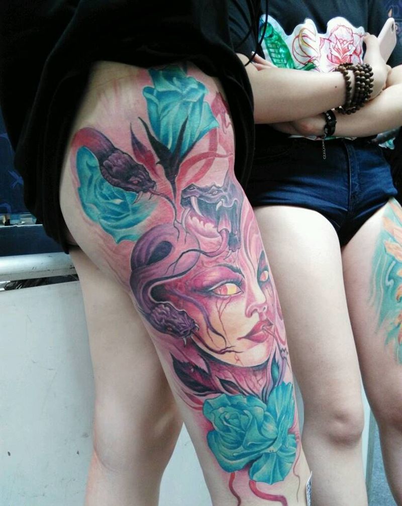 • T网红王老大花腿龙纹身图片_腿部新传统纹身图案