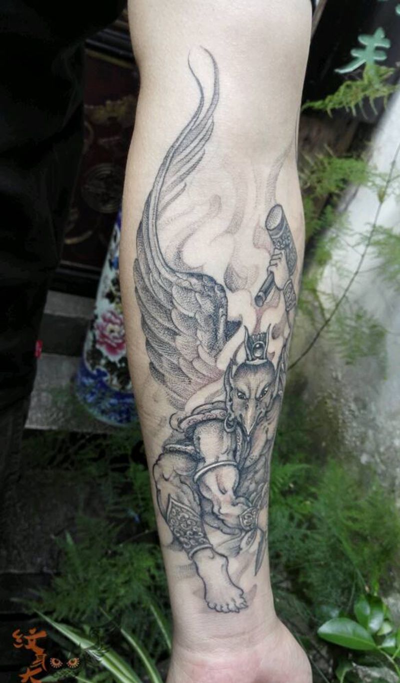 雷震子纹身图片_腿部传统习俗国画人物鬼神原创纹身图案