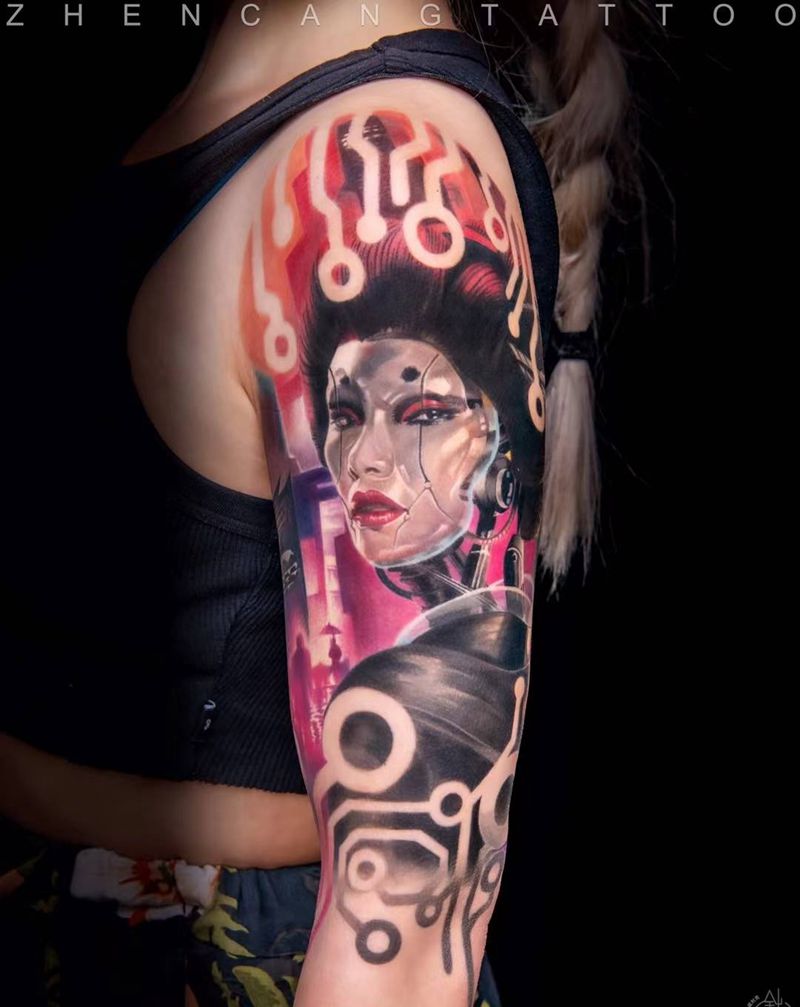 赛博艺妓纹身图片_手臂欧美写实彩色写实赛博朋克纹身图案