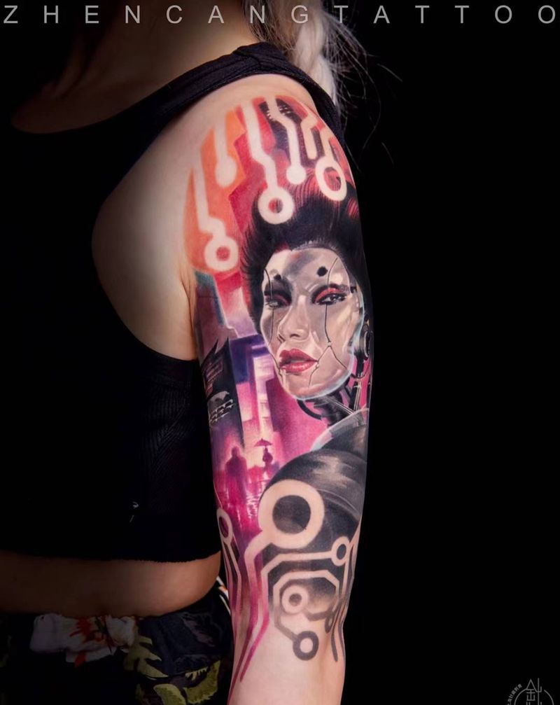 赛博艺妓纹身图片_手臂欧美写实彩色写实赛博朋克纹身图案