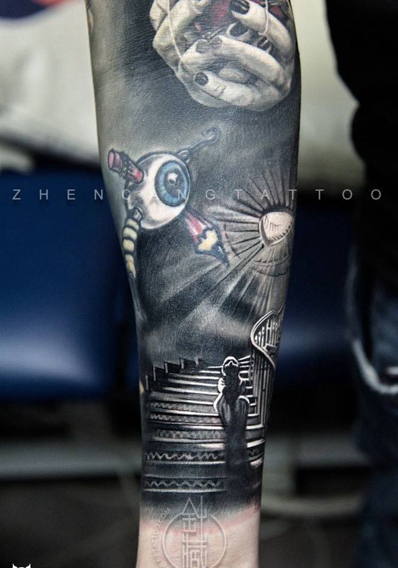望 • 空纹身图片_成品手臂写实人物针藏刺青邵钢纹身图案
