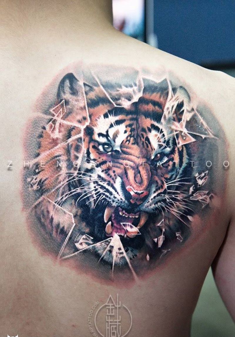 凶猛老虎 | 针藏刺青邵钢纹身作品纹身图片_成品背部写实动物针藏刺青邵钢纹身图案
