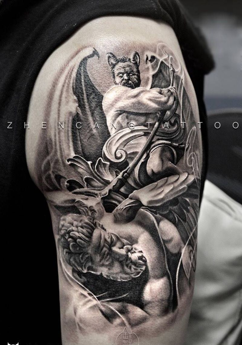天使 与 魔鬼 针藏刺青邵钢作品纹身图片_成品手臂欧美写实宗教针藏刺青邵钢纹身图案