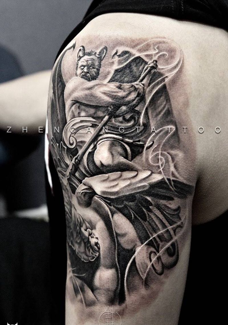 天使 与 魔鬼 针藏刺青邵钢作品纹身图片_成品手臂欧美写实宗教针藏刺青邵钢纹身图案