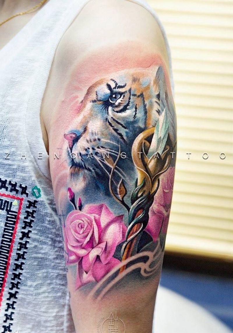 粉色玫瑰与王者权杖 | 针藏刺青邵钢纹身作品纹身图片_成品手臂清新写实动物邵钢针藏刺青原创纹身图案
