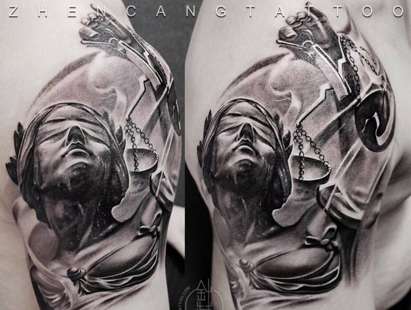 正义女神 | 针藏刺青 ·邵钢· 作品纹身图片_成品手臂写实欧美鬼神针藏刺青邵钢宗教人物纹身图案